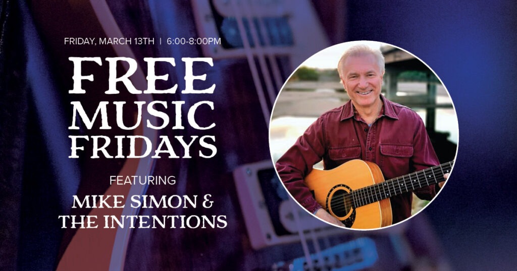 Free Music Fridays – Mike Simon & The Intentions March 13, 2026 6:00 – 8:00pm Mike’s connection to music was strong from an early age. He used to look up […]